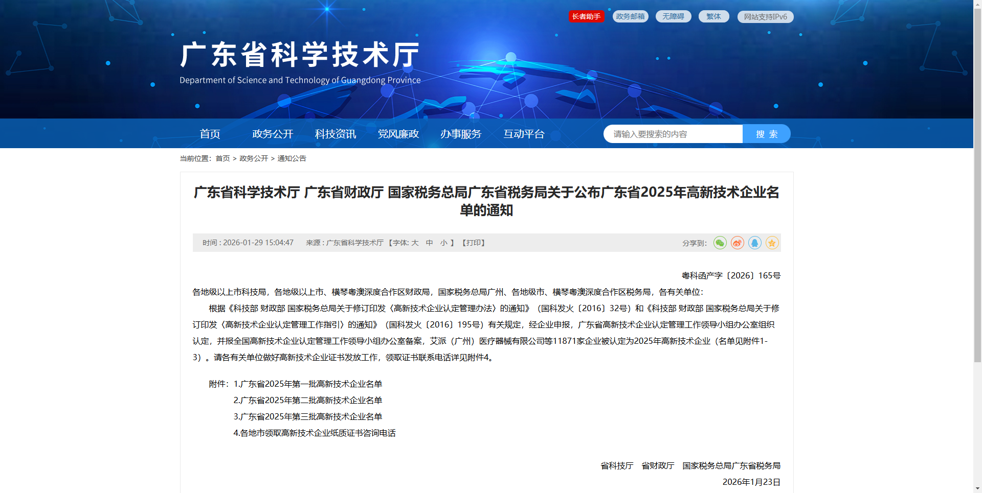 根据《科技部 财政部 国家税务总局关于修订印发〈高新技术企业认定管理办法〉的通知》(国科发火〔2016〕32号)和《科技部 财政部 国家税务总局关于修订印发〈高新技术企业认定管理工作指引〉的通知》(国科发火〔2016〕195号)有关规定,经企业申报,广东省高新技术企业认定管理工作领导小组办公室组织认定,并报全国高新技术企业认定管理工作领导小组办公室备案,艾派(广州)医疗器械有限公司等11871家企业被认定为2025年高新技术企业(名单见附件1-3)。请各有关单位做好高新技术企业证书发放工作,领取证书联系电话详见附件4。